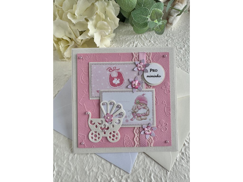 Jedinečné přáníčko k narození holčičky zdobené kvalitními papíry a dekoracemi určitě potěší každé novopečené rodiče. Toto přání má základ ze smetanového papíru silné gramáže, barevnost je laděná do miminkovské růžové. Vše ruční výroba. Každé přáníčko je opravdu originál!
