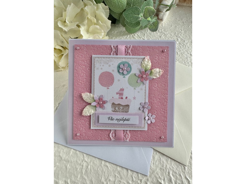 Blahopřání k prvním narozeninám dítka, zdobeno kvalitními scrapbookovými papíry a 3D dekoracemi. Toto přání má základ z bílého papíru silné gramáže, obálka je také bílá, aby ladila s přáním.