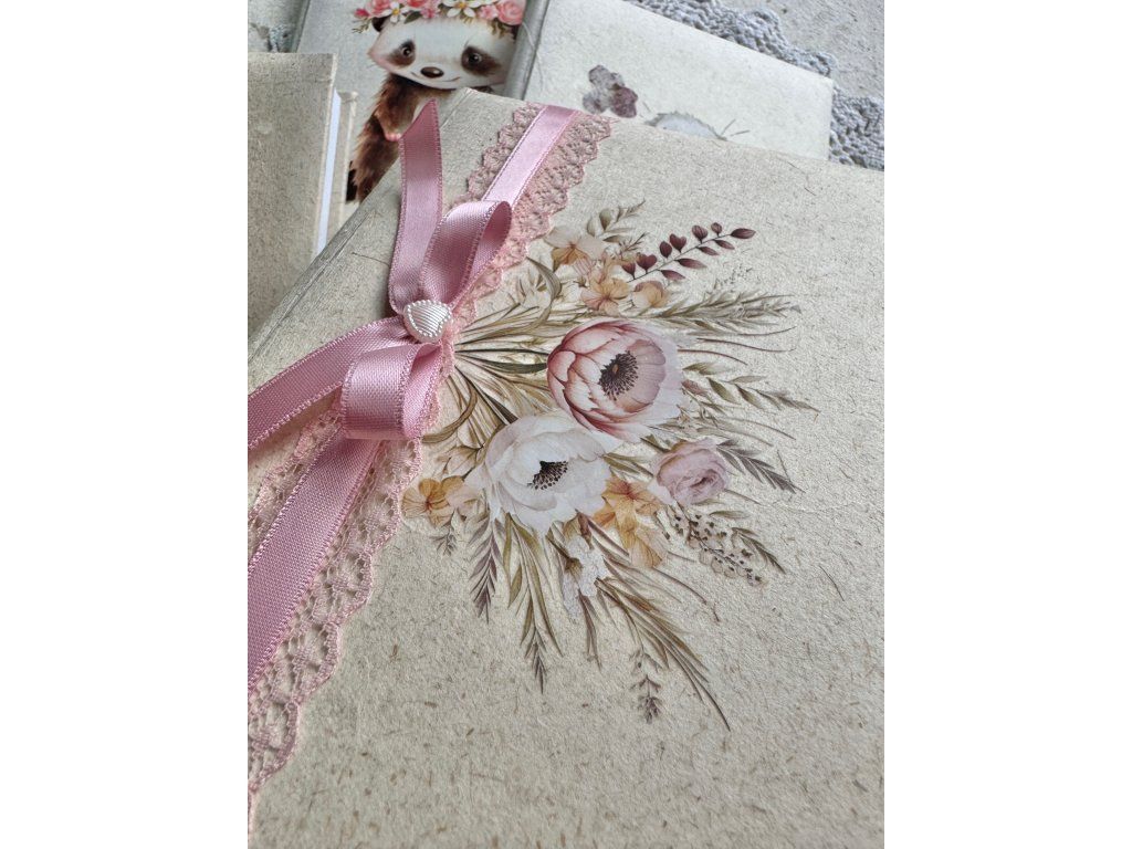 Uvnitř najdete 60 pevnějších bílých listů bez linek, ideálních pro psaní, kreslení i vkládání fotografií či drobných vzpomínek. Povrch je obalen do luxusního ručního papíru gampi, který je velmi příjemný na dotek, a doplněn speciálním nažehlovacím obrázkem s jemným motivem květin.