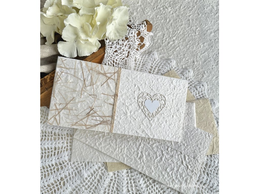 Podlouhlá obálka z ručního papíru, jemně ozdobená, perfektní pro svatební účely. Cena za 1 kus obálky a 1 kus karty k napsání textu. Baleno do celofánu. Na obálky není možno psát, ale přímo ke psaní je určena karta, která je přiložena k obálce. Karta je také z ručního papíru, buď z morušového lisovaného nebo nepálského Lokty.