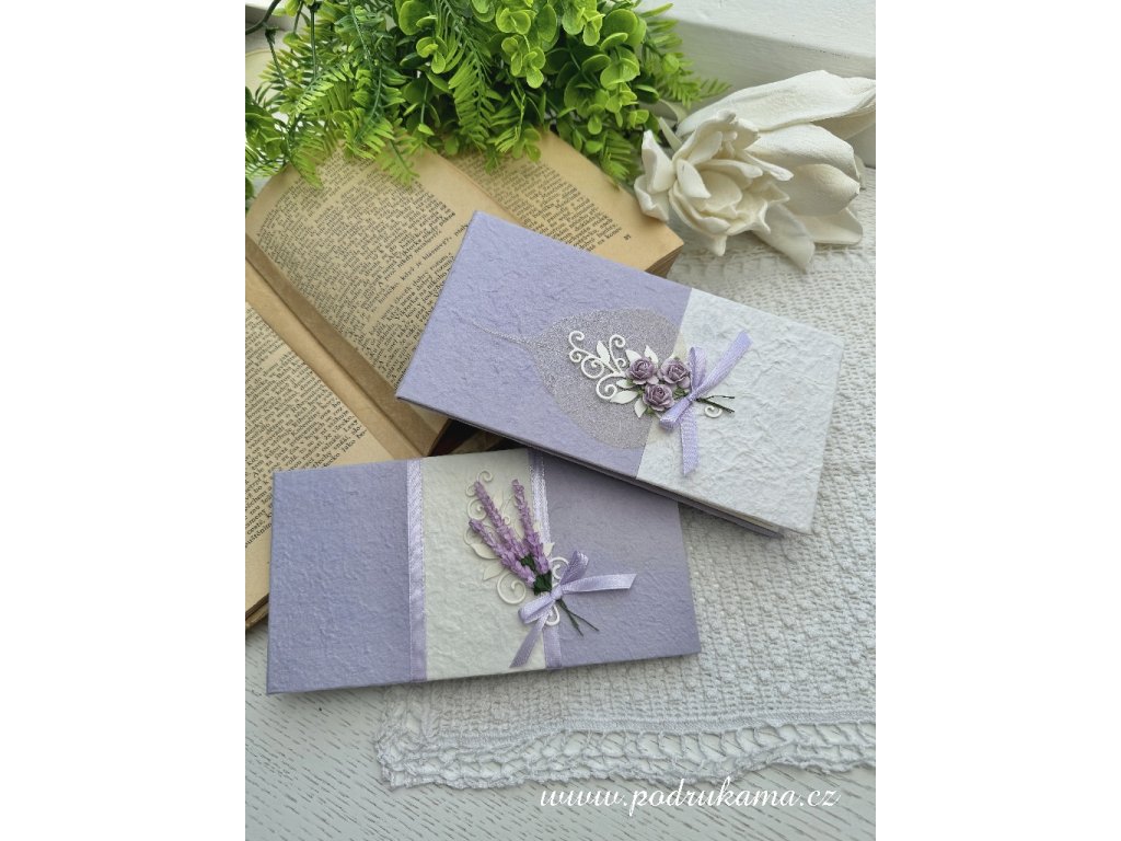 Drobnější dárková složka v levandulovém designu, vše ruční papír - morušový a japonský s laminací krajky, uvnitř naleznete obálku z ručního papíru velikosti 17 x 9,5 cm a kartu k napsání gratulačního textu.