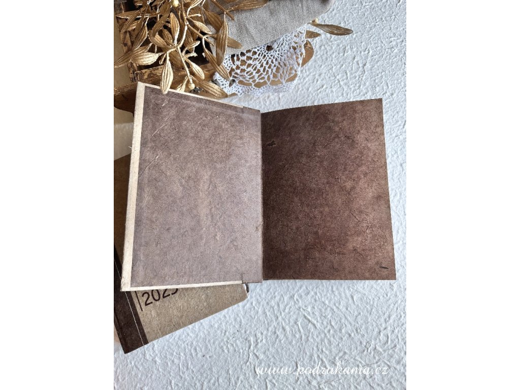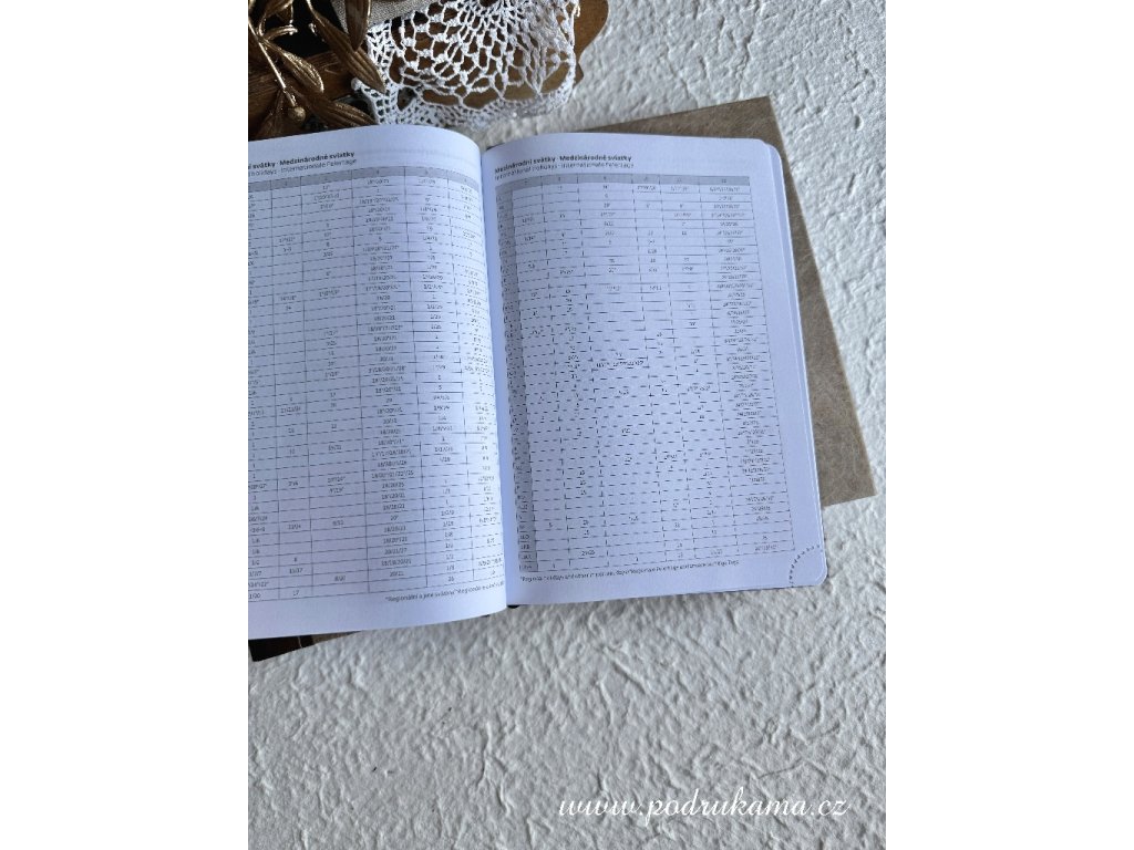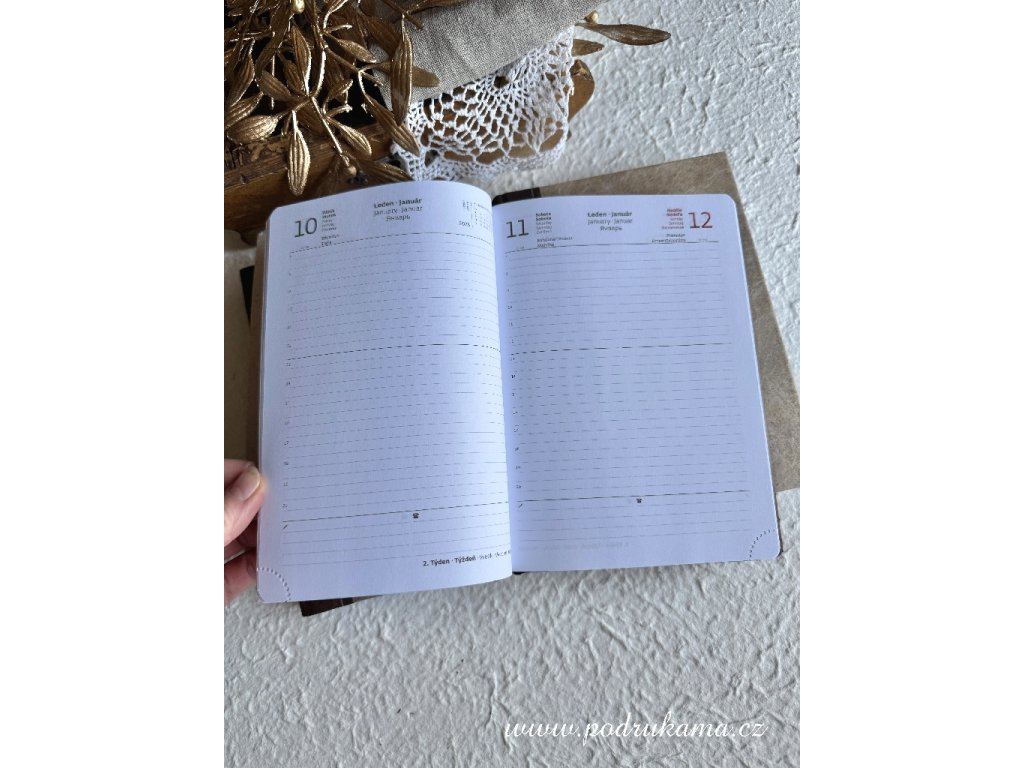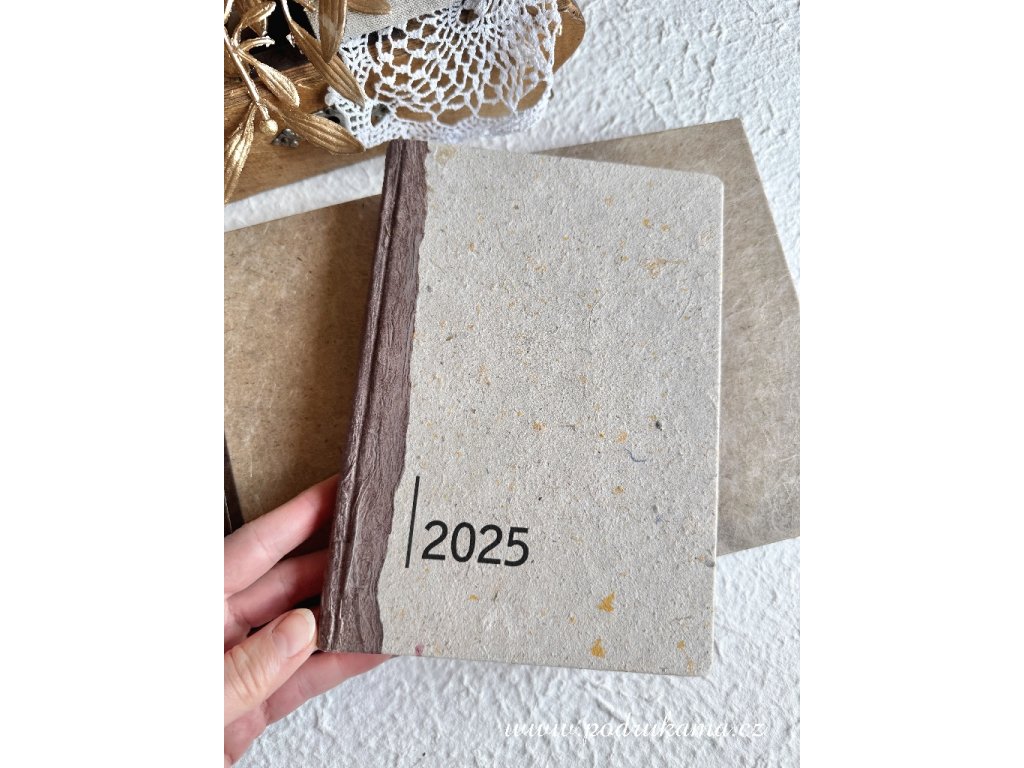 - Diář na rok 2025 s denními záznamy, jmeninami, čas rozdělený po hodinách 7-20 h, na každé stránce dole místo na poznámky.