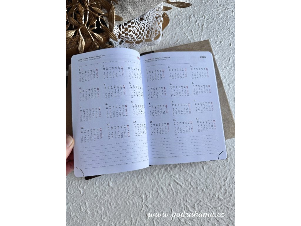 - Obsahuje listy s osobními údaji, plánovač dovolené, planovací kalendář, mezinárodní předvolby, státní a mezinárodní svátky, roční výhled na rok 2025 a 2026, na konci pár stránek na poznámky.