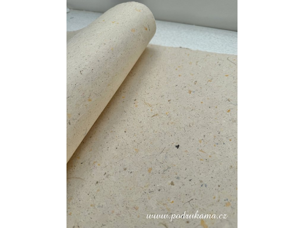 "Eko-recyklo" morušový ruční papír v gramáži okolo 150 g/m2 v přírodním odstínu s viditelnými zbytky rostlinek, květů a bylin, velikost archu 59 x 42 cm. Tento papír vznikl z recyklátu zbytků různých druhů morušových papírů z mé výroby, a zakázkově jej zpracovala česká papírna Papyrea. Je lisovaný, ale má texturu a také přírodní trhaný okraj. Je ho možno použít i do tiskárny. Papíry jsou vhodné na jakékoli tvoření, přáníčkování i na přebaly bloků či alb, dobře se trhá i lepí. Vhodný na kaligrafii a výrobu svatebního oznámení a pozvánek.