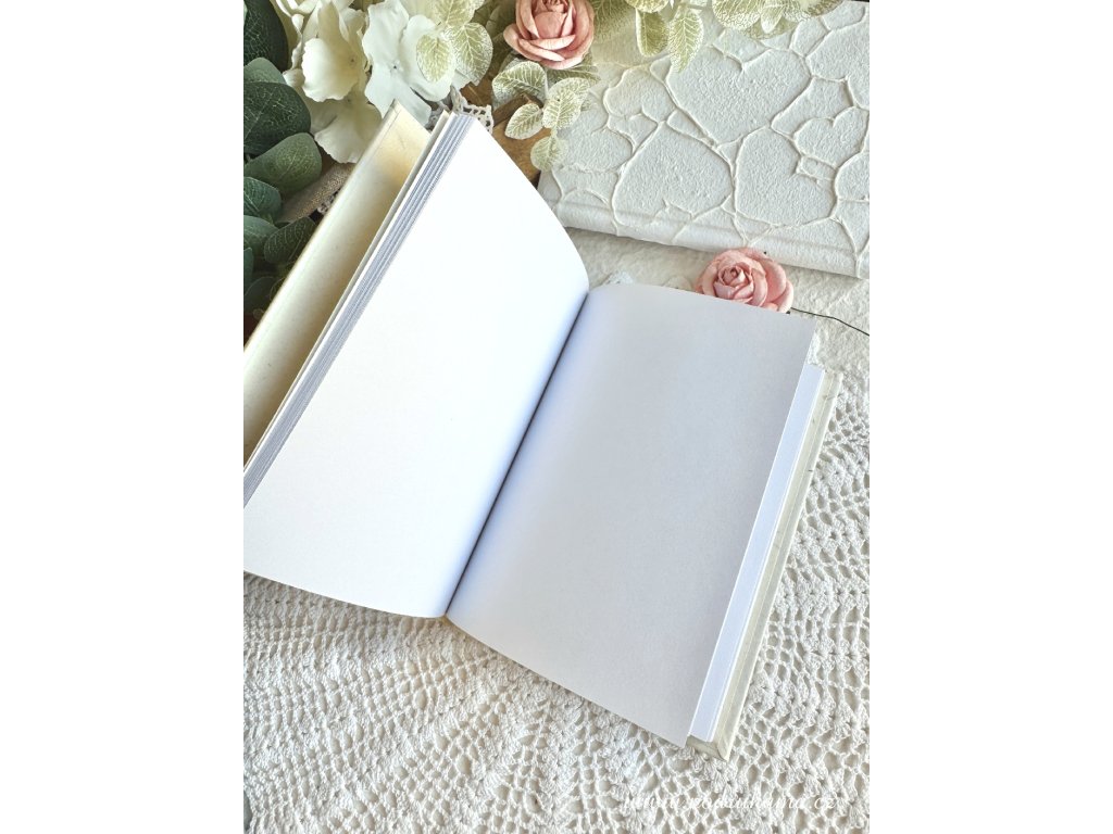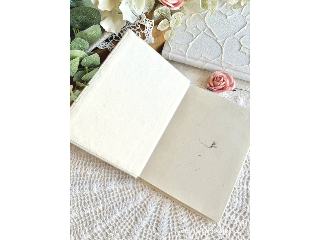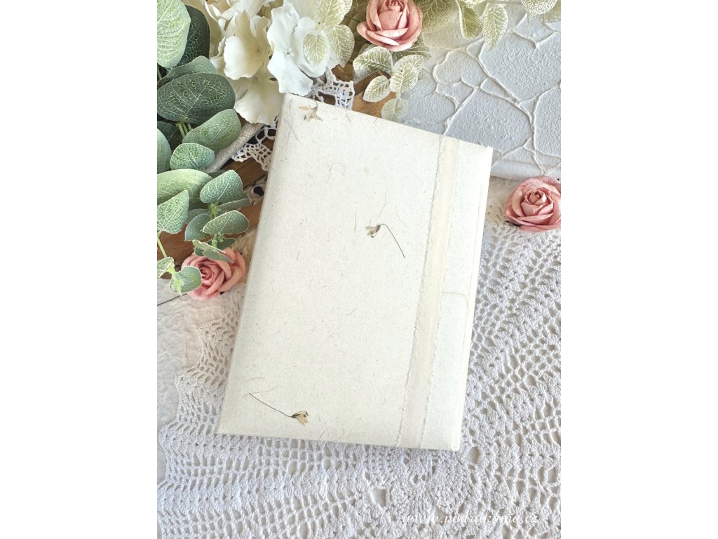 Památník je velikosti 19 x 14 cm, vazba šitá, počet stran 60, bílé listy jsou pevnější cca 100-120 g/m2 vhodné tedy, jak na kreslení, tak i psaní. Obal a předsádka je z ručního papíru gampi s vlisovanými kvítky, ostatní papír je klasický, čistě bílý.