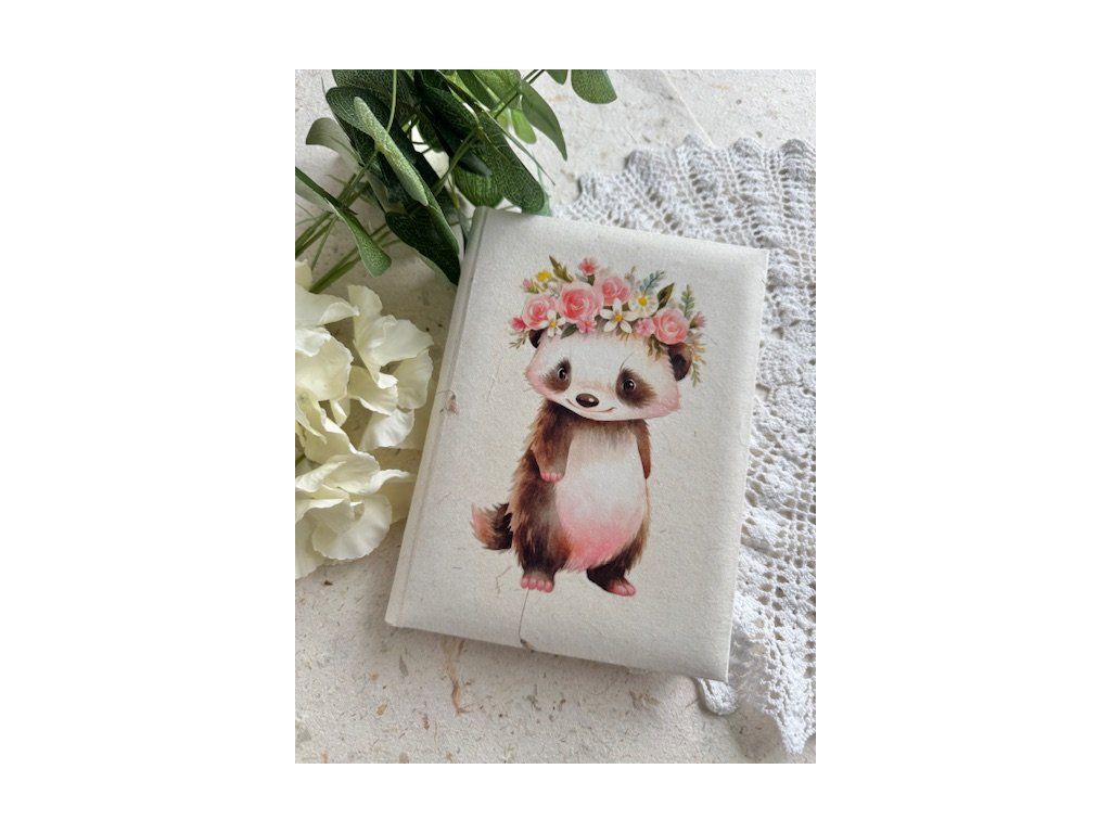 Památník je velikosti 19 x 14 cm, vazba šitá, počet stran 60, bílé listy jsou pevnější cca 100 g/m2 vhodné tedy, jak na kreslení, tak i psaní, nedoporučuji jen psaní fixy. Obal a předsádka je z ručního papíru gampi s vlisovanými kvítky, ostatní papír je klasický, čistě bílý. Přední stranu zdobí kvalitní nažehlovací obrázek.