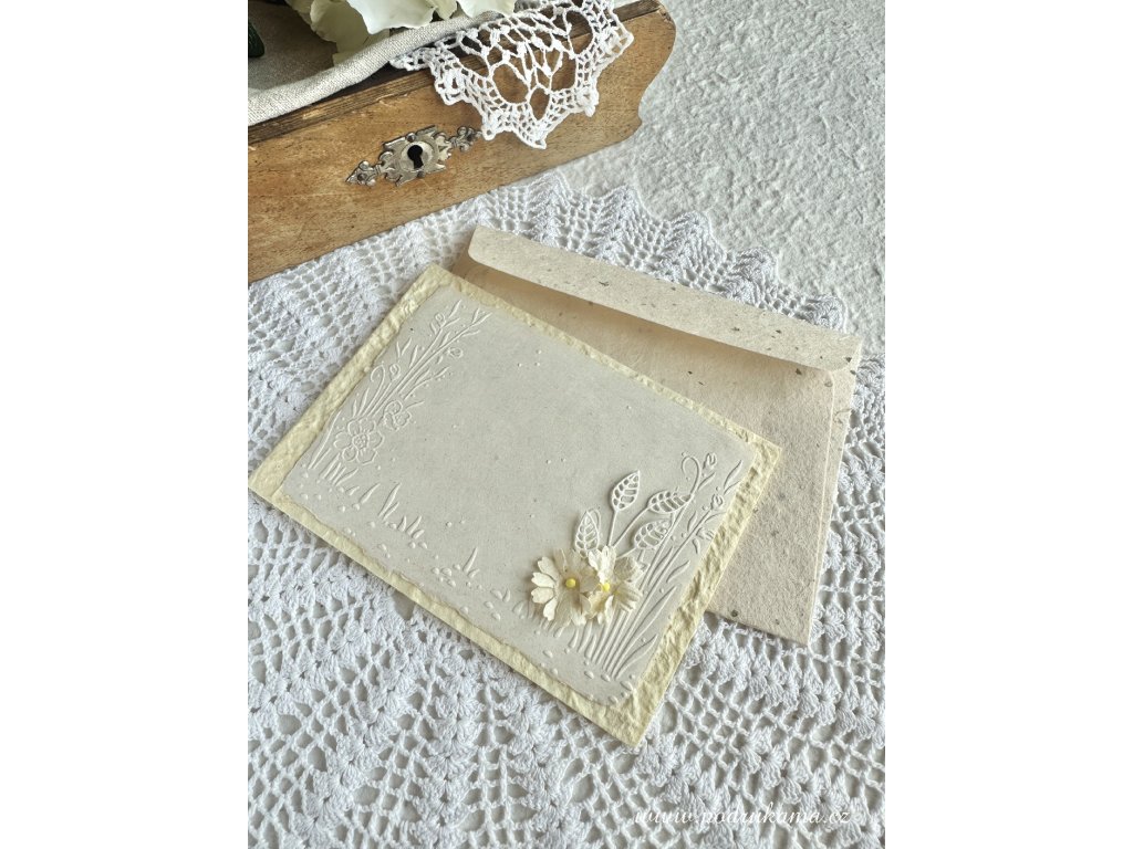 Jednoduché přání z ručního papíru s krásným reliéfním vzorem, vhodné jak ke svatebním účelům nebo jako libovolná gratulace. Cena za 1 kus přání včetně obálky + 1 kus karty k napsání textu. Baleno do celofánu.
