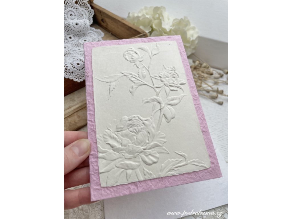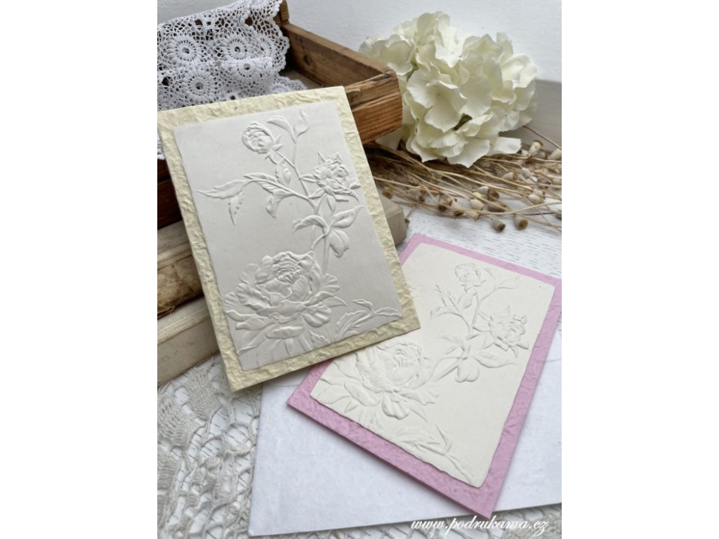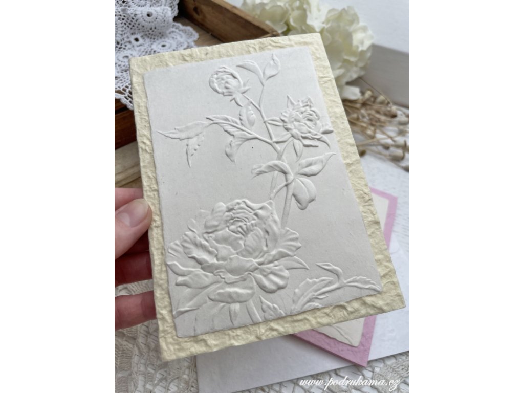 Jednoduché přání z ručního papíru s krásným reliéfním vzorem růže, vhodné jak ke svatebním účelům nebo jako libovolná gratulace. Cena za 1 kus přání včetně obálky + 1 kus karty k napsání textu. Baleno do celofánu.